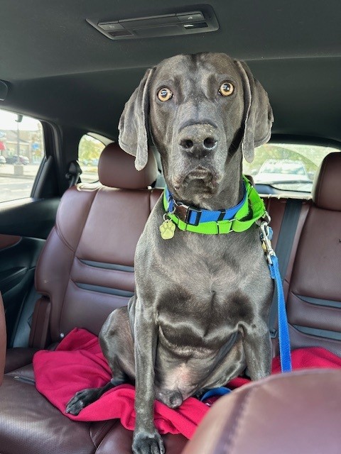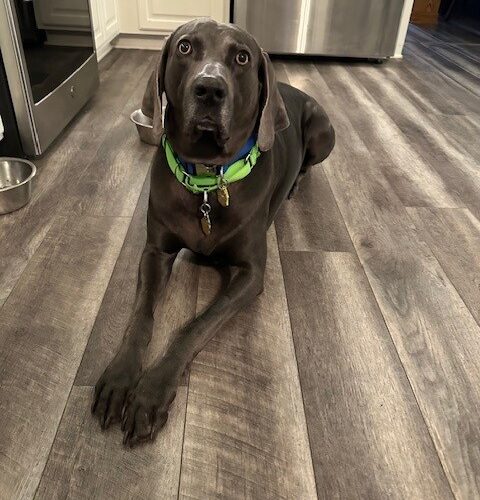 Axel is a 6-year-old silver-blue Weimaraner who’s discovering the joys of indoor life after spending much of his life outdoors. He’s learning that people are pretty great and is quickly getting the hang of being part of a family.
