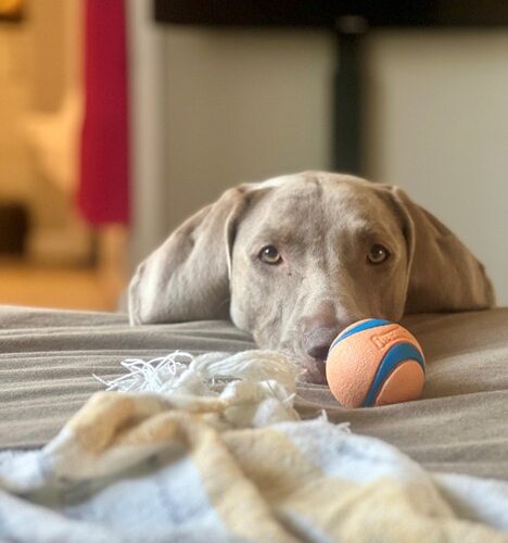Her favorite pastime? Playing with her Chuckit balls! Daisy lights up with joy during playtime, and her enthusiasm is contagious. Because of her size and energy, she may accidentally knock over small children during play, so supervision is recommended. That said, she’s been raised around kids and is gentle and respectful.