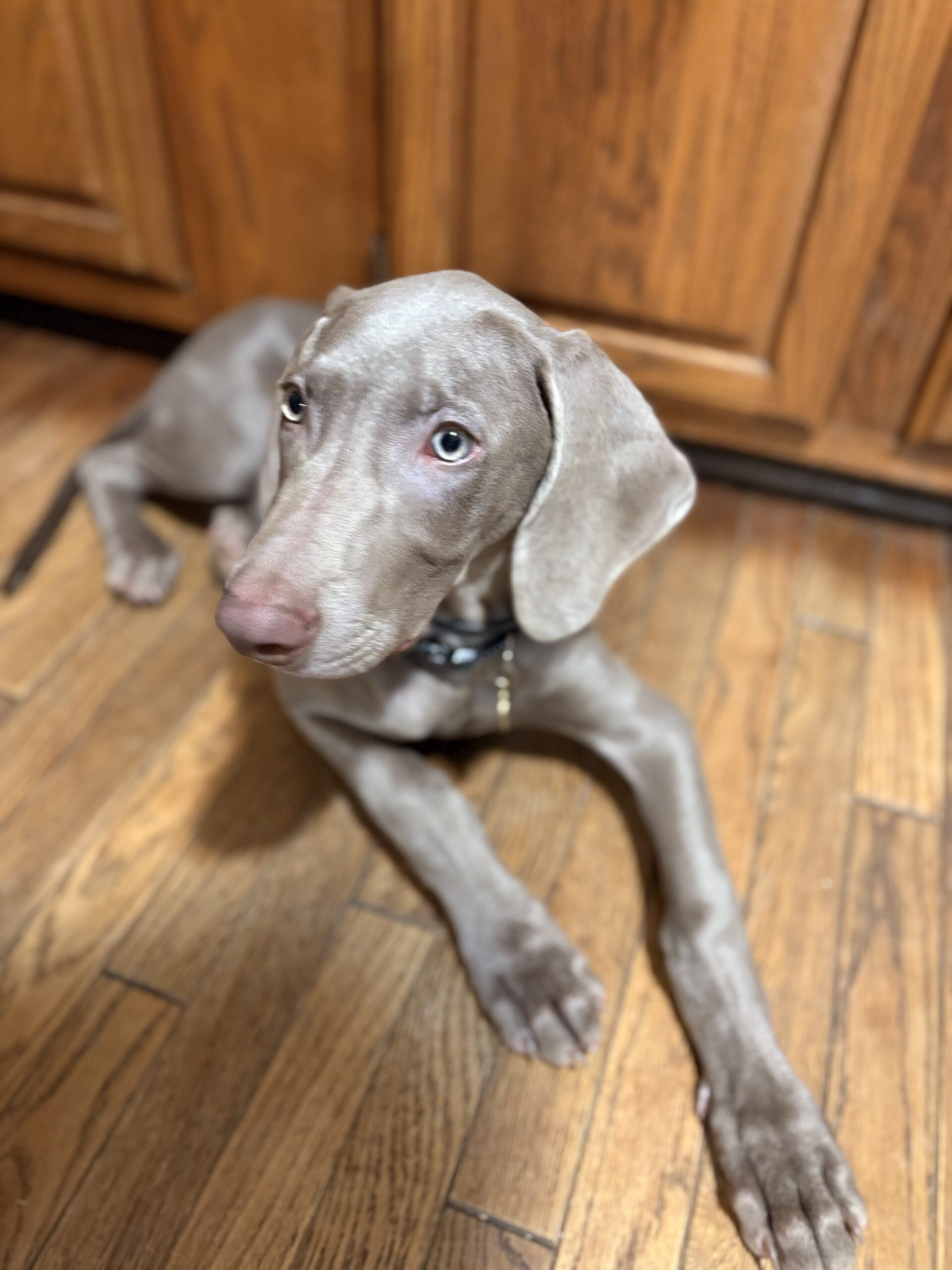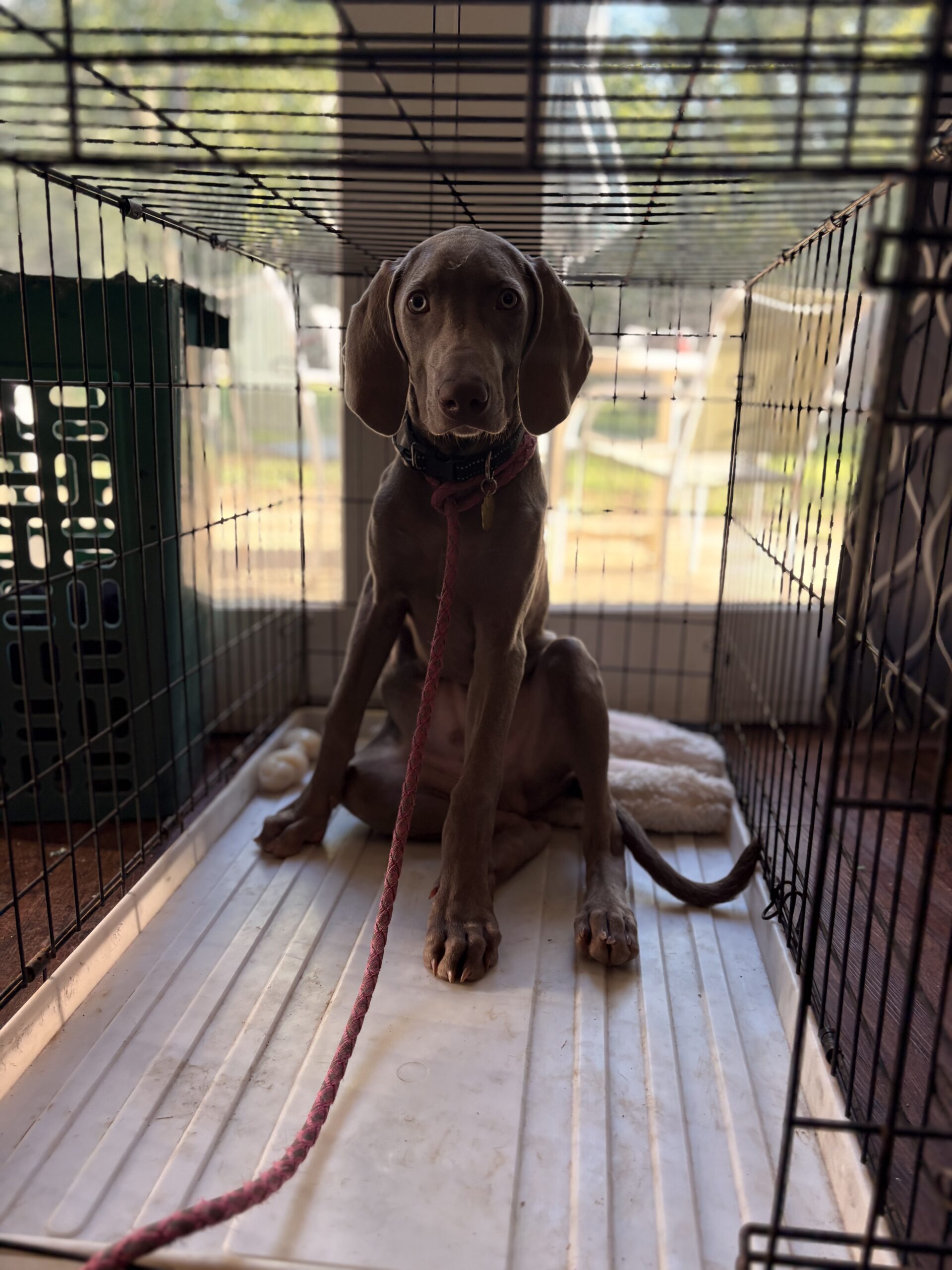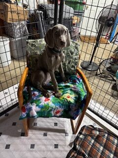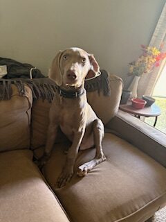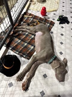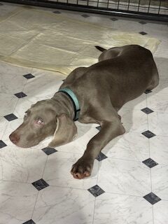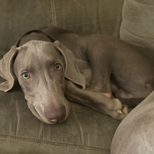 Sweetest lil’ stinker you’ll ever meet! Bucky is a five-month-old bundle of curiosity, energy, and love — currently in his “Weimaraptor” phase, but still wants to fall asleep touching his person. He’s a bright, goofy pup who’s learning fast: mostly housebroken, happily goes into his crate, and knows “sit” (though sometimes only when it suits him). Treats are the key to his heart!
