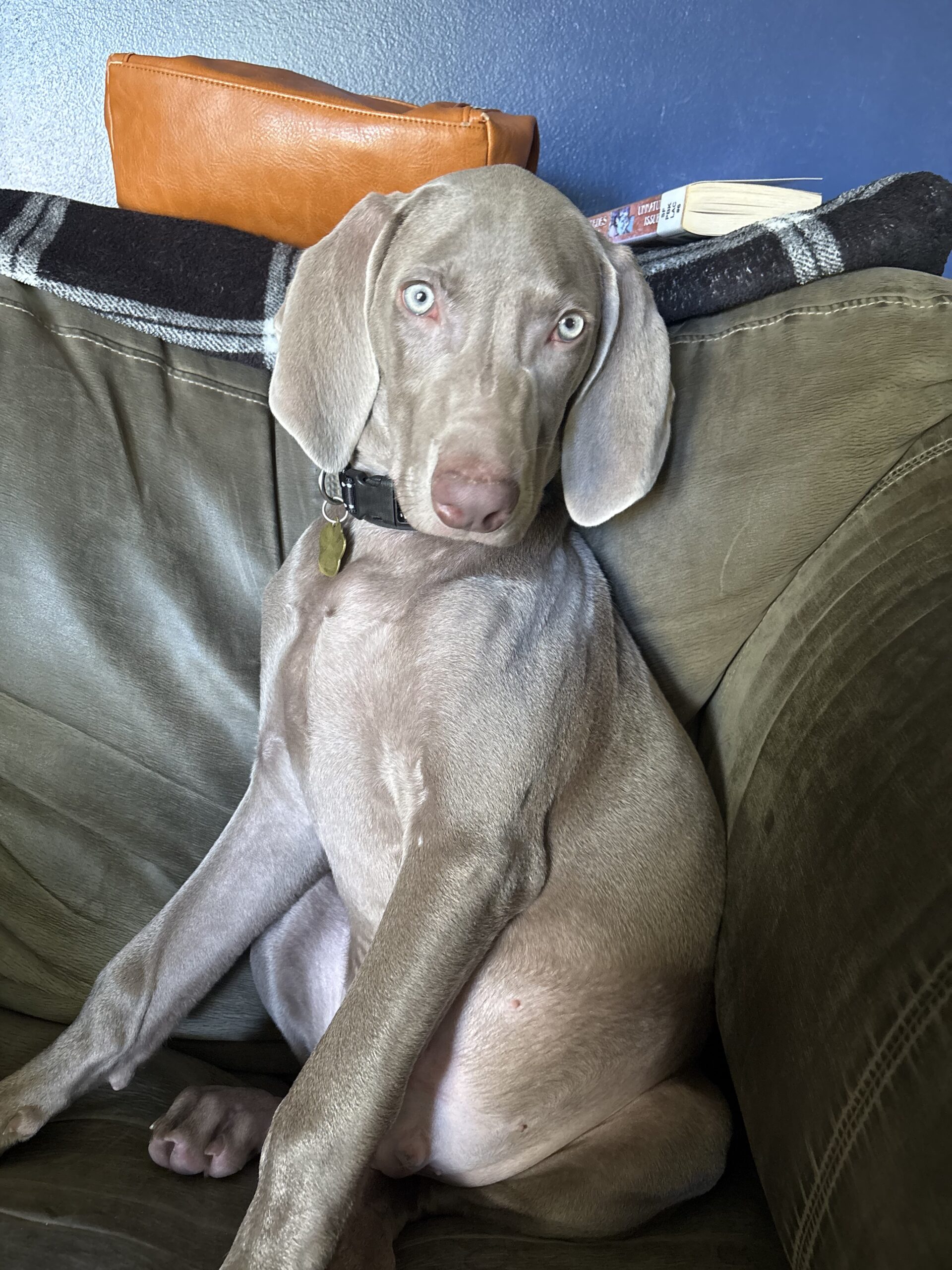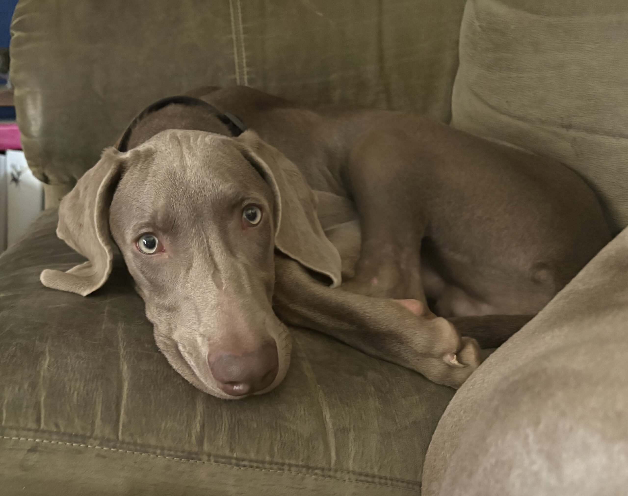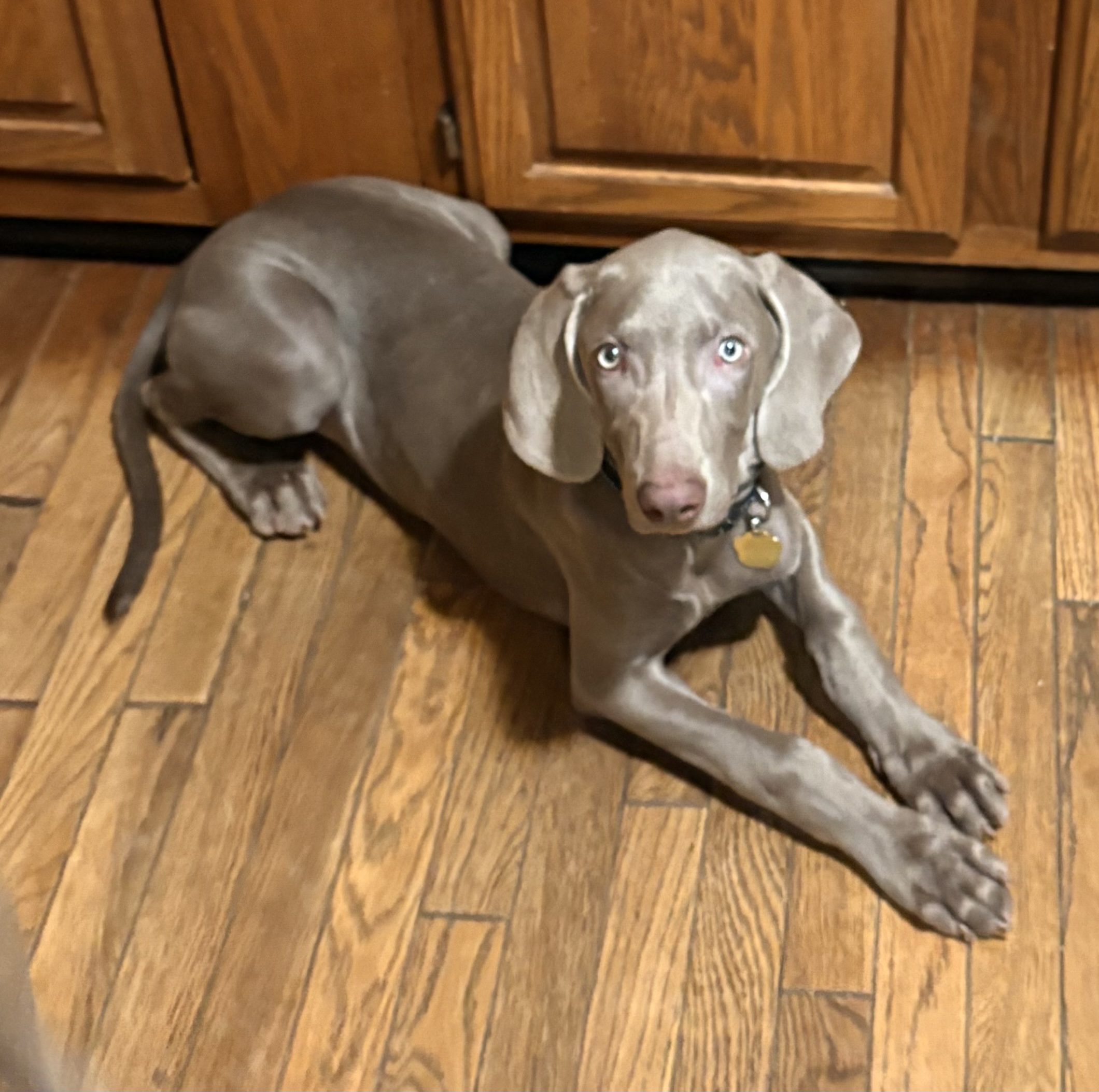 Sweetest lil’ stinker you’ll ever meet! Bucky is a five-month-old bundle of curiosity, energy, and love — currently in his “Weimaraptor” phase, but still wants to fall asleep touching his person. He’s a bright, goofy pup who’s learning fast: mostly housebroken, happily goes into his crate, and knows “sit” (though sometimes only when it suits him). Treats are the key to his heart!