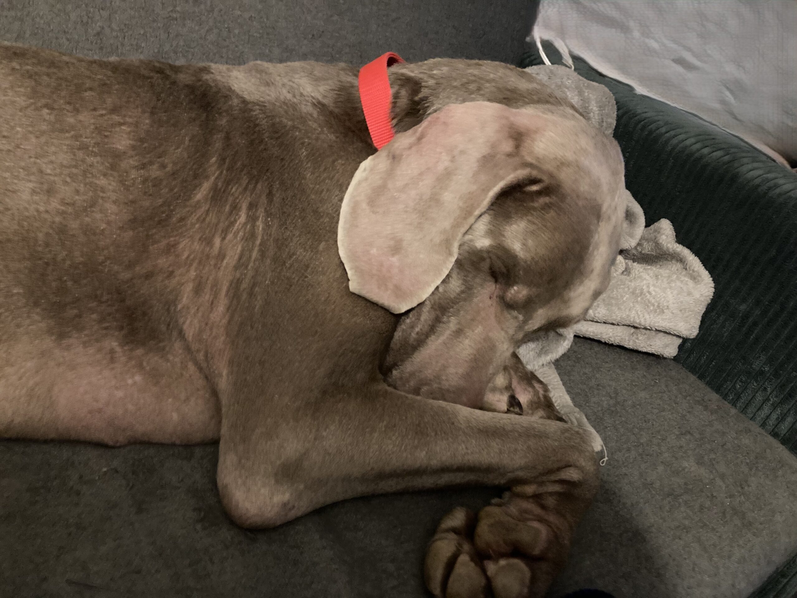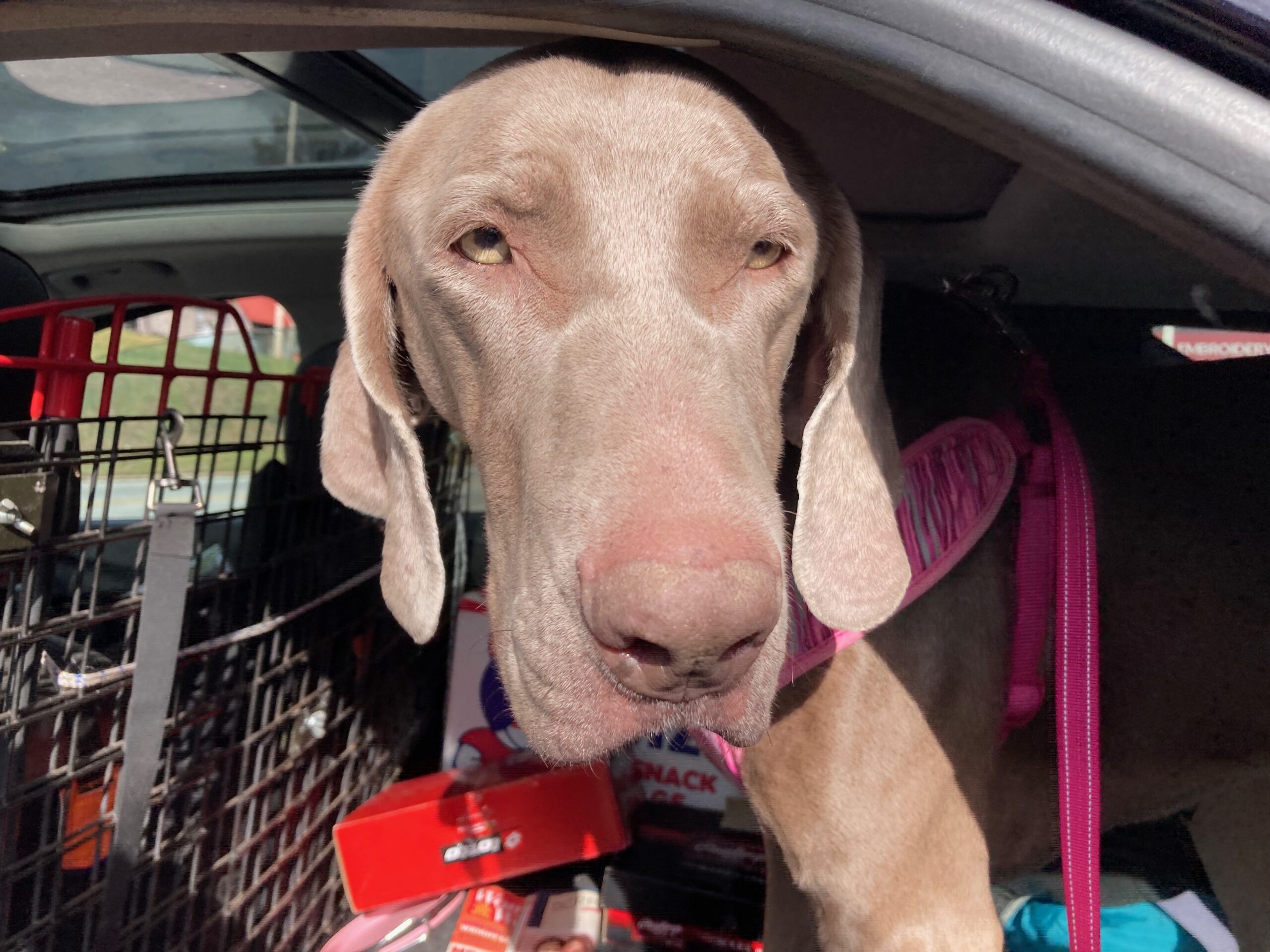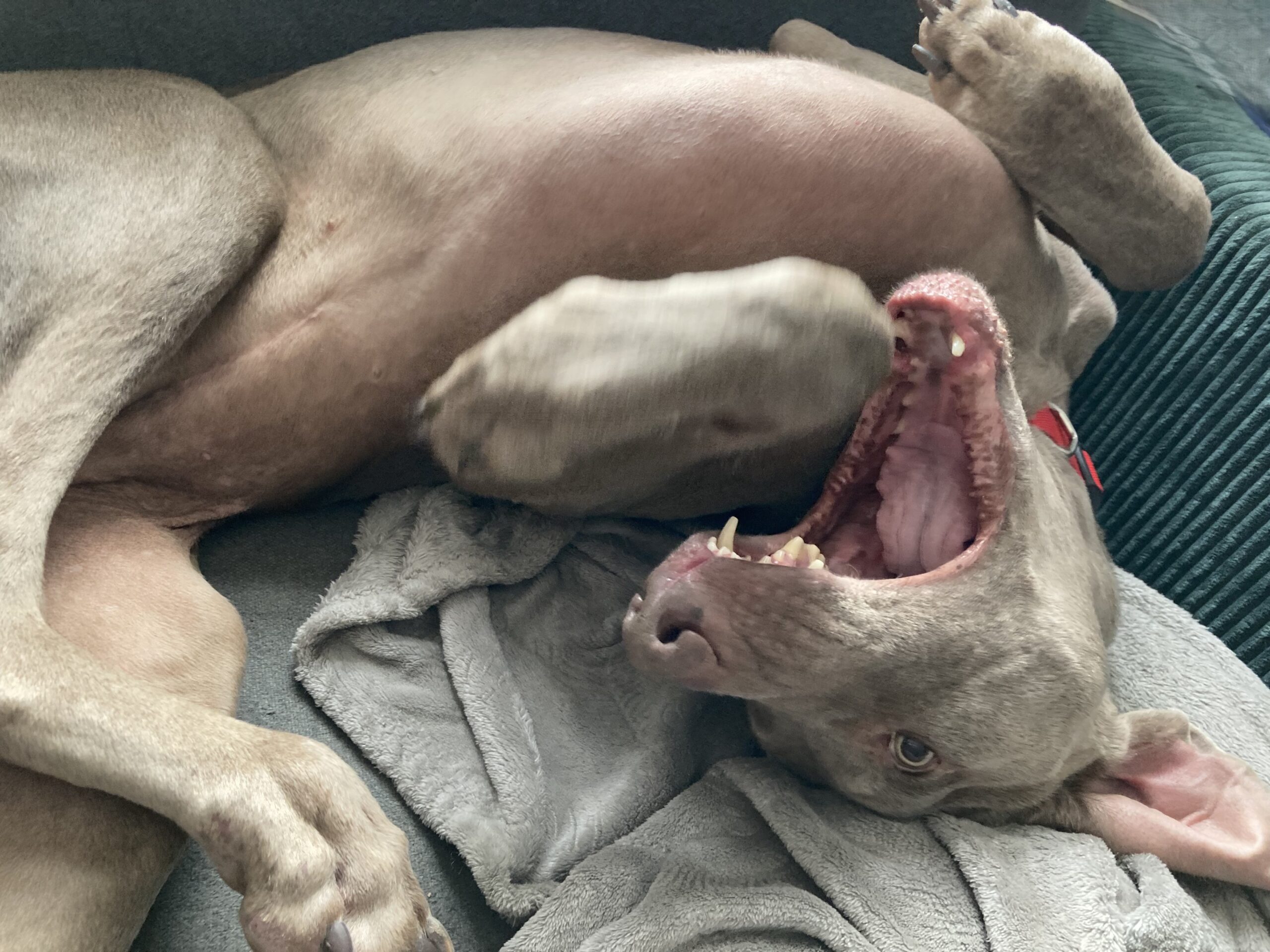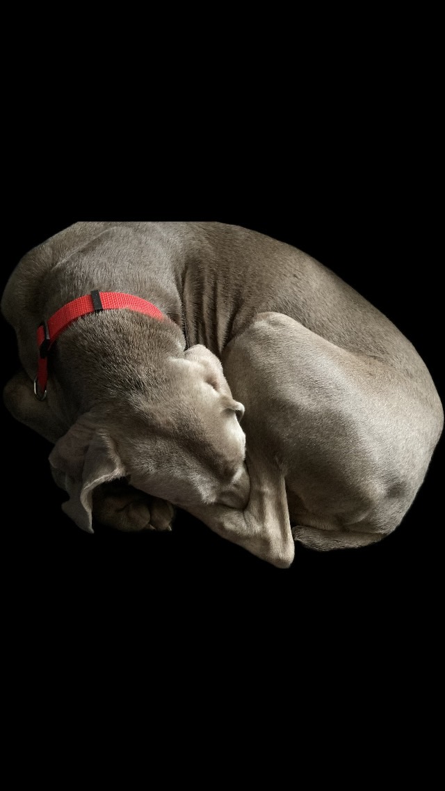 Sammie is an 8-year-old, tall, elegant gray Weimaraner with a heart as soft as her cuddles. This sweet girl thrives on being close to her person—whether that’s curling into a perfect little ball beside you in bed or snuggling up on the couch. Wherever you are, she’ll happily be your shadow.
